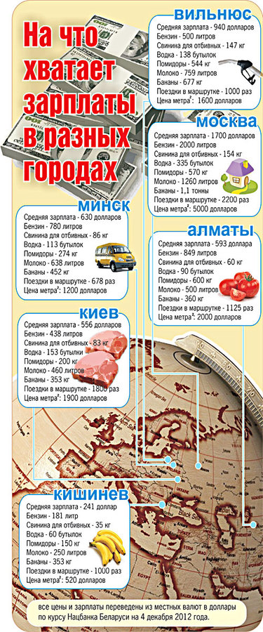 Вот мы и решили не просто сравнить нынешние зарплаты в разных крупных городах в странах-соседях и странах-друзьях, а перевести содержимое кошельков в цены на ходовые продукты и услуги. Выбирайте, кому что ближе, и сравнивайте!