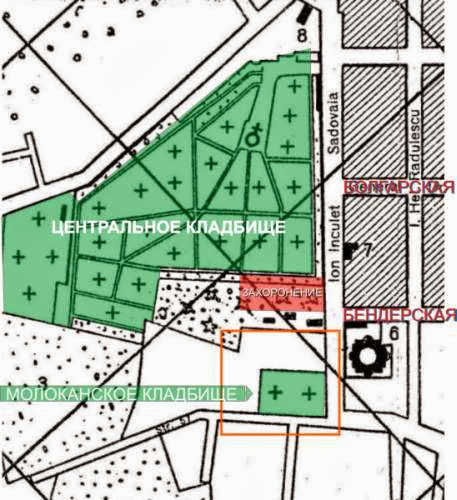 C плана Кишинёва 1940-х гг. Жёлтым кругом отмечено описываемый участок кладбища.