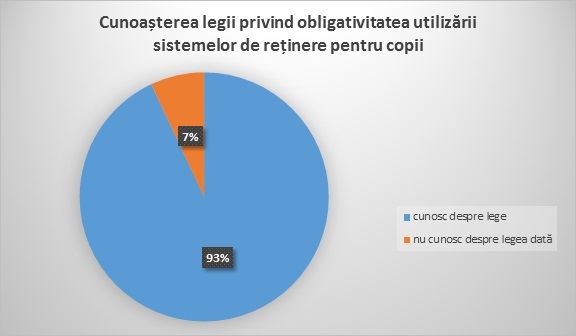 În ceea ce privește cunoașterea legii privind obligativitatea utilizării unui sistem de reținere la transportarea copilului sub 12 ani, în vehicul, statistica este destul de îmbucurătoare. Astfel aprox. 93% din respondenți cunosc despre legea respectivă. Din păcate, aceasta nu înseamnă că toți se conformează prevederilor legii date.