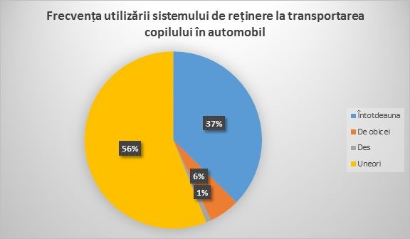 În așa fel, rezultatele sondajului au arătat că aproximativ 40% din părinții copiilor sub 12 ani nu utilizează un sistem de reținere pentru copii, adecvat vârstei și caracteristicilor fiziologice ale copilului, la transportarea acestuia în vehiculul auto, iar din numărul celora care totuși dețin un sistem de reținere special pentru copii, doar 37% îl utilizează în mod permanent, pe când marea majoritate doar uneori.