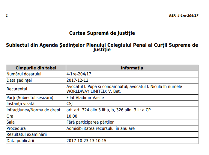 Curtea Supremă de Justiție anunță că va decide în privința admisibilității recursului în anulare în dosarul lui Vladimir Filat la data de 12 decembrie 2017. Informația a apărut pe site-ul Curții Supreme de Justiție, transmite Ziarul de Gardă.