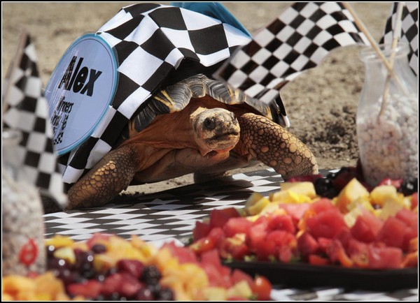 Но вот самая быстрая черепаха достигает финиша, и гул восхищенных криков и аплодисментов встречает ее. Победителя увенчивают лавровым венком, но, в сущности, проигравших в гонке нет: всех участников забега накормят сочными овощами и сладкими фруктами. Глядя на то, с каким увлечением черепашки поедают листья и плоды, даже не верится, что всего полчаса назад они думали лишь о беге. Гонки Zoopolis 500 приносят пользу зоопарку, привлекая клиентов, а заодно и нам: мы в очередной раз убеждаемся, что черепахи - это очень милые и забавные существа. И быстрые к тому же.