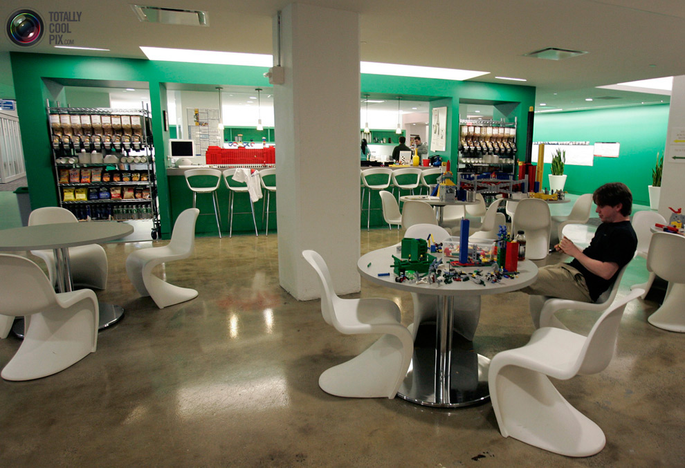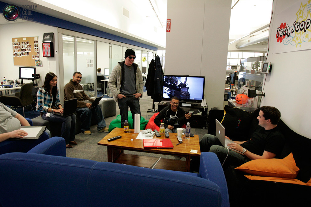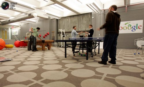 4. Сотрудники компании в "игровой комнате", где они могут провести время играя в пинг-понг или снукер, или занимаясь на тренажерах. В 2011 году Google была признана компанией с наилучшей репутацией в США, опередив Microsoft, Sony и другие компании.![]()