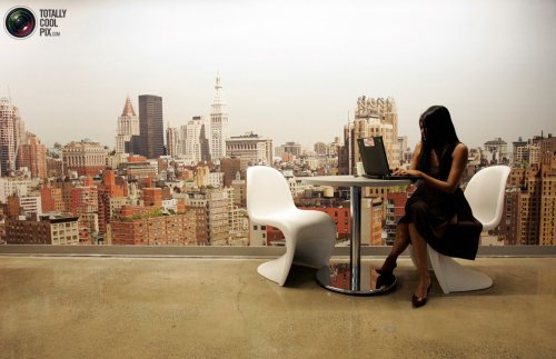 17. Сотрудница компании «Google» работает с ноутбуком перед изображением панорамы Нью-Йорка, в нью-йоркском офисе компании.