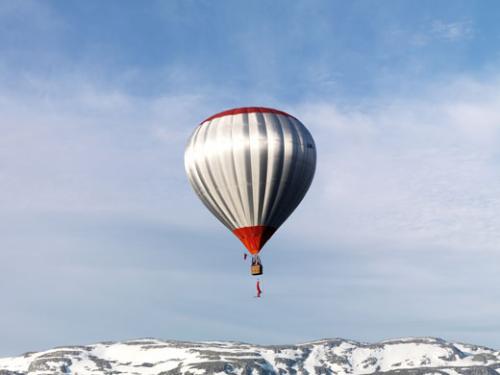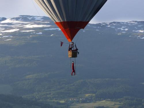 …на трапеции, подвешенной с корзины воздушного шара, в небе над городом Восс…