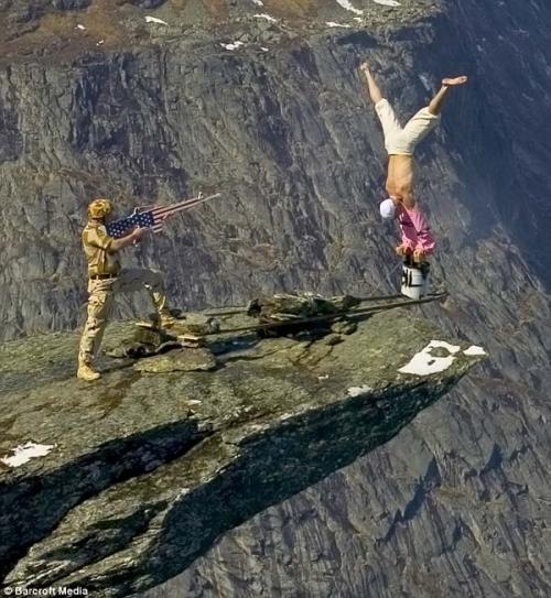 А этот снимок был сделан в образовательных целях для полицейских Норвегии - Роннингсбакен балансирует над пропастью и изображает террориста, в то время как помощник, изображая военного, направляет на него оружие…