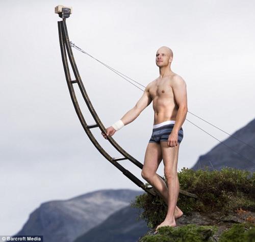 Отчаянный трюкач, для которого это увлечение давно стало профессией, балансировал на одной руке на специальном гимнастическом снаряде, установленном на мысе Flydalsjuvet.