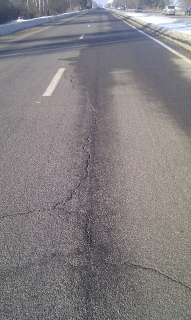 Îmi venea să plâng când vedeam cum, la sfârșit de septembrie, se aplica stratul superior de asfalt în timp ce ploua torențial, iar șoseaua era plină de bâltoace. Gropile pe care le vedeți în imaginea din stânga au apărut chiar la 2 luni de la încheierea reparațiilor. După prima ninsoare ele s-au transformat în adevărate cratere.