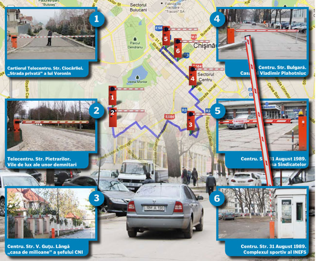 Scandalul barierelor auto instalate în cartierele de elită din capitală a luat amploare acum trei ani, când primarul de Chişinău, Dorin Chirtoacă, a emis o dispoziţie privind demolarea barierelor care blocau accesul pe strada Ciocârliei şi pe strada Bulgară de lângă Pretura Centru. Barierele au fost dezinstalate temporar. În acest context, se cere precizat că pe adresa Bulgară nr. 41 locuieşte deputatul PD Vlad Plahotniuc. Iar în cartierul de elită din perimetrul străzilor Ciocârliei şi Pietrarilor din capitală, potrivit primăriei, familia Voronin a acaparat un teren de circa 4 hectare, pe care a construit mai multe case de lux.