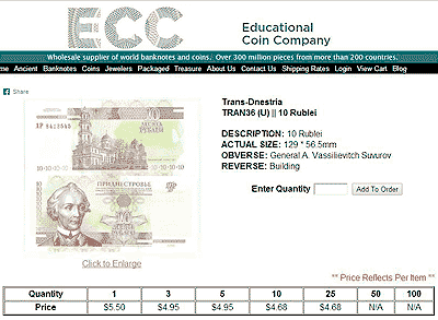 Site-ul oficial al „Educational Coin Co., Inc.”, companie care a încheiat mai multe contracte cu Gintaras Ziaunys, propune spre comercializare atât bancnote emise de regiunea transnistreană (transnistria fiind inclusă la categoria ţări – n.r) după anii 2000, cât şi bancnote emise de Banca Naţională a Moldovei. Astfel, trei bancnote de 10 lei MDL sunt comercializate cu 3,30 dolari USD, adică cu un dolar mai mult decât ar putea fi cumpăraţi la casele de schimb valutar după cursul oficial al BNM.